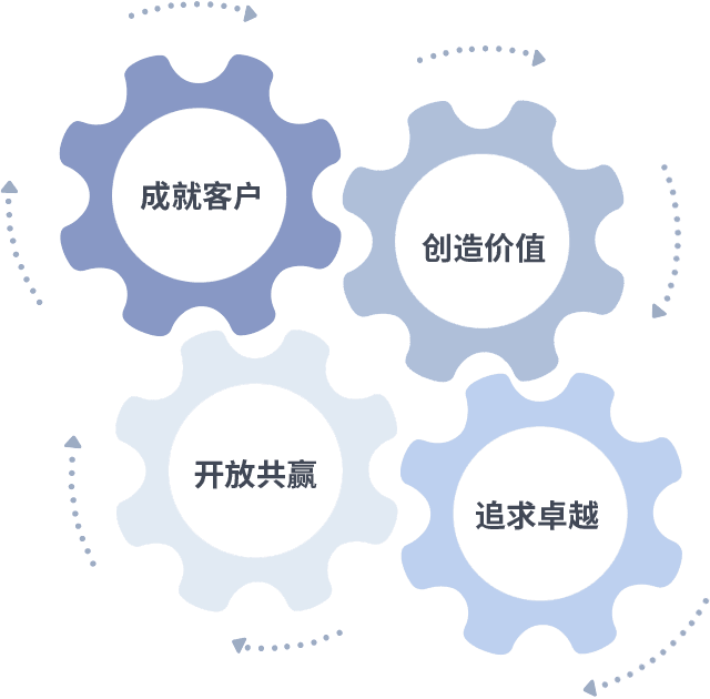 成就客户是一切决策的出发点,,创造价值是衡量所有工作的标准,,,追求卓越是我们做事做人的态度,,,开放共赢是我们的格局也是最终的结果。。。价值观的齿轮环环相扣,,,,推动着组织里的每个人不断向前。。